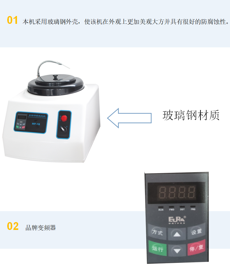 該磨拋機由底座、磨拋盤及控制面板組成。本機采用玻璃鋼外殼,使該機在外觀上更加美觀大方并具有很好的防腐蝕性。