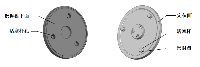 01 磨拋盤可快速更換,兩手拿住磨拋盤輕輕上提即可取下來;將另一個磨拋盤兩手拿平,目測磨拋盤的三個活塞桿孔與三個活塞桿基本對應時落下,感覺其中一個孔對應時,輕微擺動磨拋盤使另兩個也對應后將盤持平插入,再用手控壓一下,使磨拋盤下面與磨拋座的定位面完全接觸。